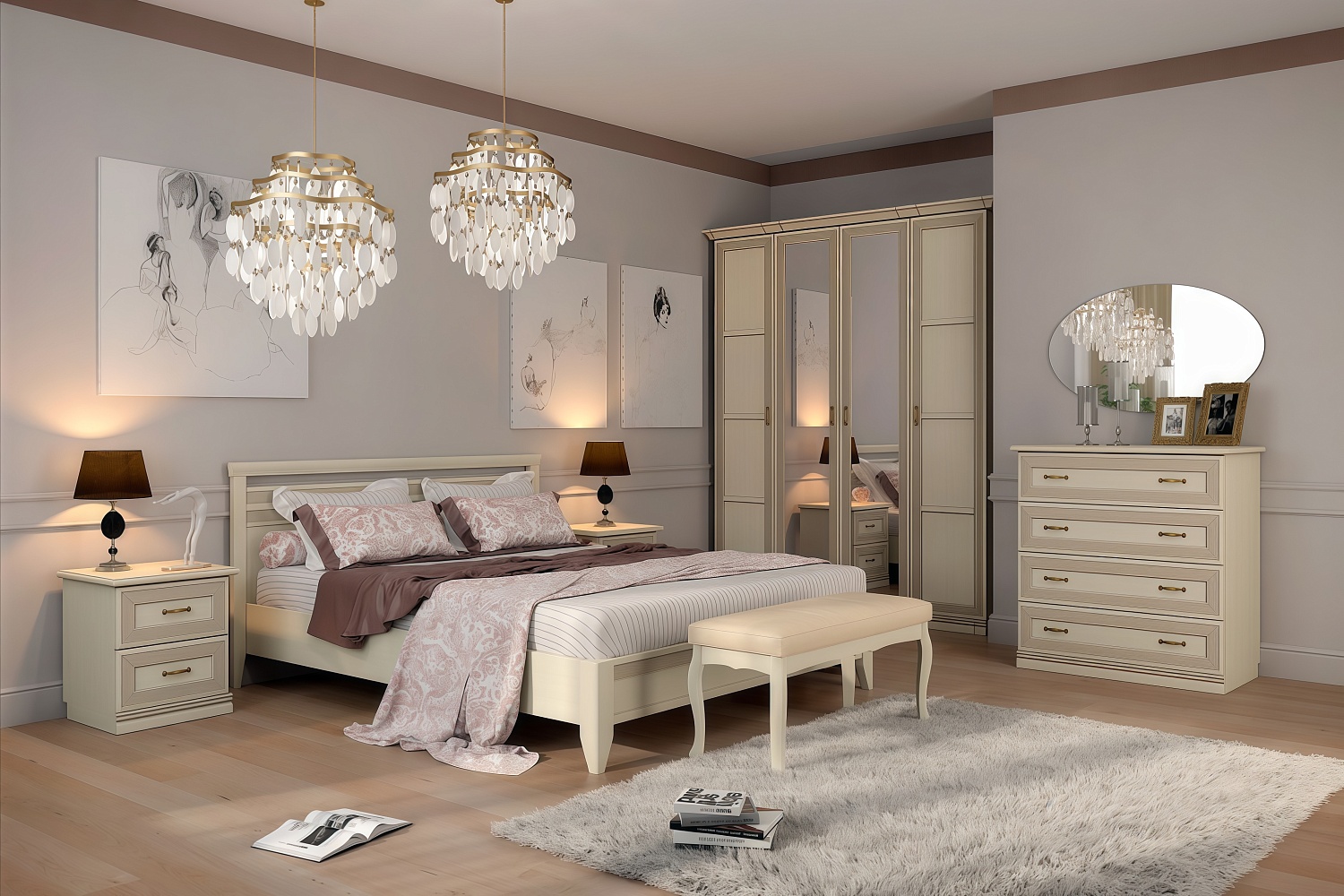 Чтобы сделать интерьер более завершенным, вы можете дополнительно приобрести металлические аксессуары в бронзовых оттенках и абстрактные постеры с яркими акцентами. Для большего удобства композицию можно завершить мягким пуфом или банкеткой в тон мебели. Конечно же, не забудьте про туалетный столик, который сделает утренние и вечерние ритуалы еще приятнее.