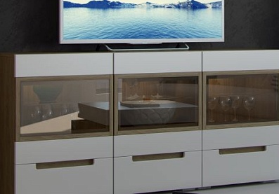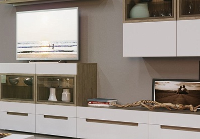 - Корпус мебели выполнен в цвете «швейцарский вяз», фасады — в цвете «белый матовый»;