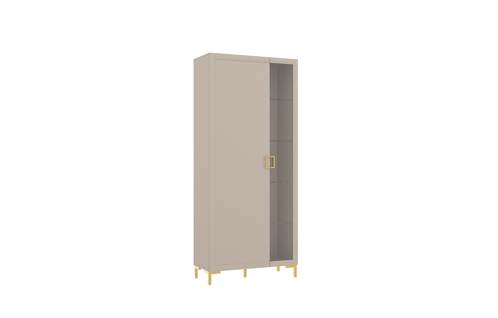 - Внутреннее наполнение: 4 стеклополки 6 мм за стеклянным фасадом, 1 полка ЛДСП 16 мм, и выдвижная штанга — за глухим;